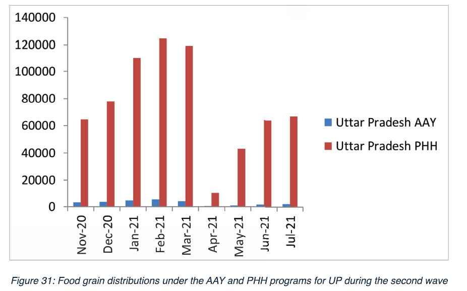 The study showed that the UP govt distributed 3876962.97 MT of ration during the second wave of Covid-19. The average distribution per person stands at 16.29 KG. The distribution was done under PMGKY that has been extended till November 2021. Five KG of Wheat/Rice is being distributed by the state government free of cost to 3.6 crore families.