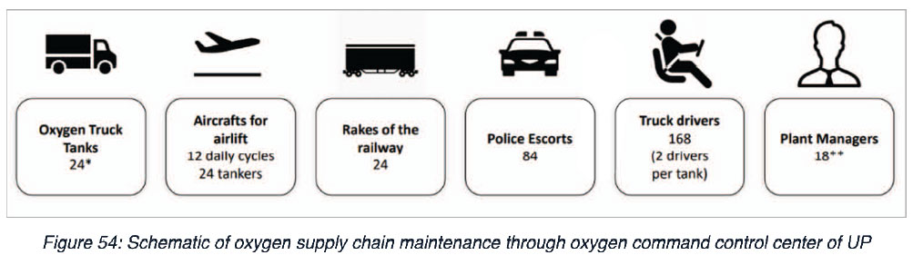 During the period of April end to May mid in 2021, due to a high number of positive cases, the oxygen demand was at its peak in the state. During this period, many hospitals across India reported a shortage of medical oxygen, including Uttar Pradesh. Though oxygen was available, the supply chain was not adequate. Government of India had provided funds to establish Oxygen plants in the states across India, but the study suggests only UP, and Assam pushed forward in setting up those plants. Uttar Pradesh formulated an extensive supply chain using GPS trackers for the oxygen trucks to ensure it reaches to all hospitals in time.