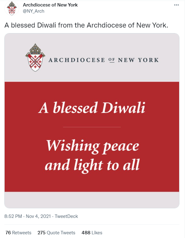 Since the report was published, the Archdiocese of New York has deleted the tweet. The Diwali wish is no longer visible on its Twitter account.