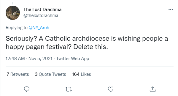 Another fanatic tweeted, “Seriously? A Catholic archdiocese is wishing people a happy pagan festival? Delete this.”