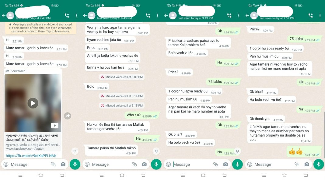 Gaurang Rana, one of the residents who received the above message shared that he has been getting messages offering Rs 1 crore for his house. As can be seen in above chat, the person identifies himself as a Muslim and says that he is ready to pay Rs 1 crore for his house. “It should not be your concern who I am, you be concerned only with money. Do you have a problem if you are paid more than your asking price?” he said.