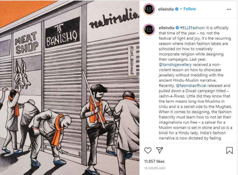 On October 31, fashion magazine Elle decided to target Hindus for trying to preserve the sanctity of the Hindu festival Diwali. In a post, they shared an illustration of men with Saffron Angvastra or Stole and accused Hindus of attacking brands that have been trying to change the very ethos of the festival. The illustration is designed by one Lord_VoldeMaut, a 19-year-old “artist” who often post anti-Hindu content on Twitter and Instagram. His profile on both social media platforms is currently locked.