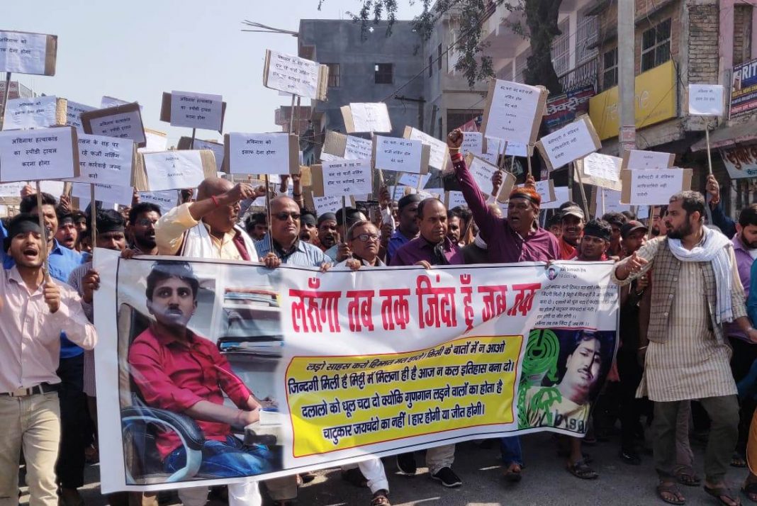 In the morning today a large number of people hit the road at Benipatti along with banners and placards. Demanding justice for Avinash Jha, they blocked the road. Local BJP MLC Ghanshyam Thakur and others joined the protest. They accused Madhubani SP of allegedly diverting the case.