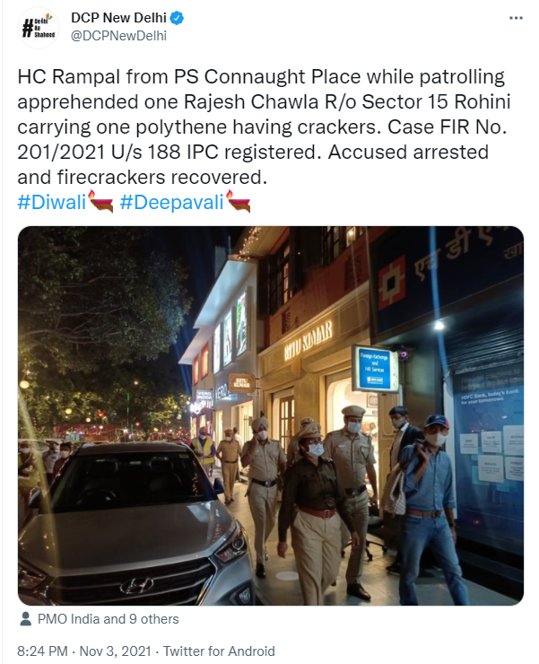 In a tweet, the official Twitter handle of DCP (New Delhi) informed that HC Rampal of Connaught Place police station had apprehended a man named Rajesh Chawla for carrying one polythene of firecrackers. Chawla is a resident of Rohini Sector 15. A First Information Report (FIR) no. 201/2021 was lodged against him under Indian Penal Code Section 188 (Disobedience to order duly promulgated by public servant).