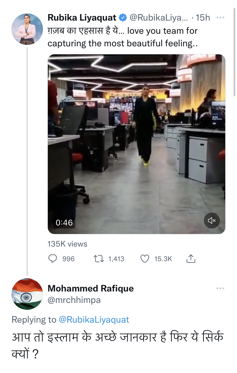 In the video, Rubika could be seen wearing a green dress and walking into the news studio from where she conducts her news shows. But the video irked Islamists on Twitter, who slammed the journalist for following the Indian culture of bowing in deference to one’s area of occupation before entering inside.