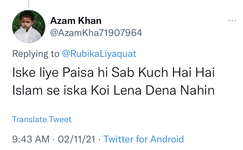 Another Islamist insinuated that Ms Liyaquat was a sellout and all she cared about was money while Islam meant nothing to her.