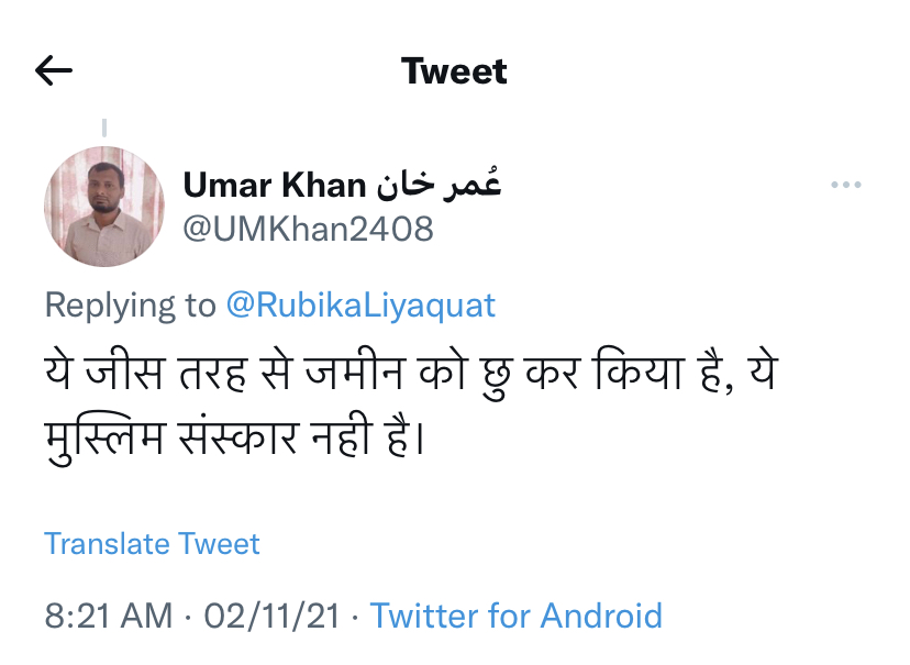 One Umar Khan on Twitter reacted on Rubika’s tweet, saying that touching the floor runs counter to the Muslim culture.