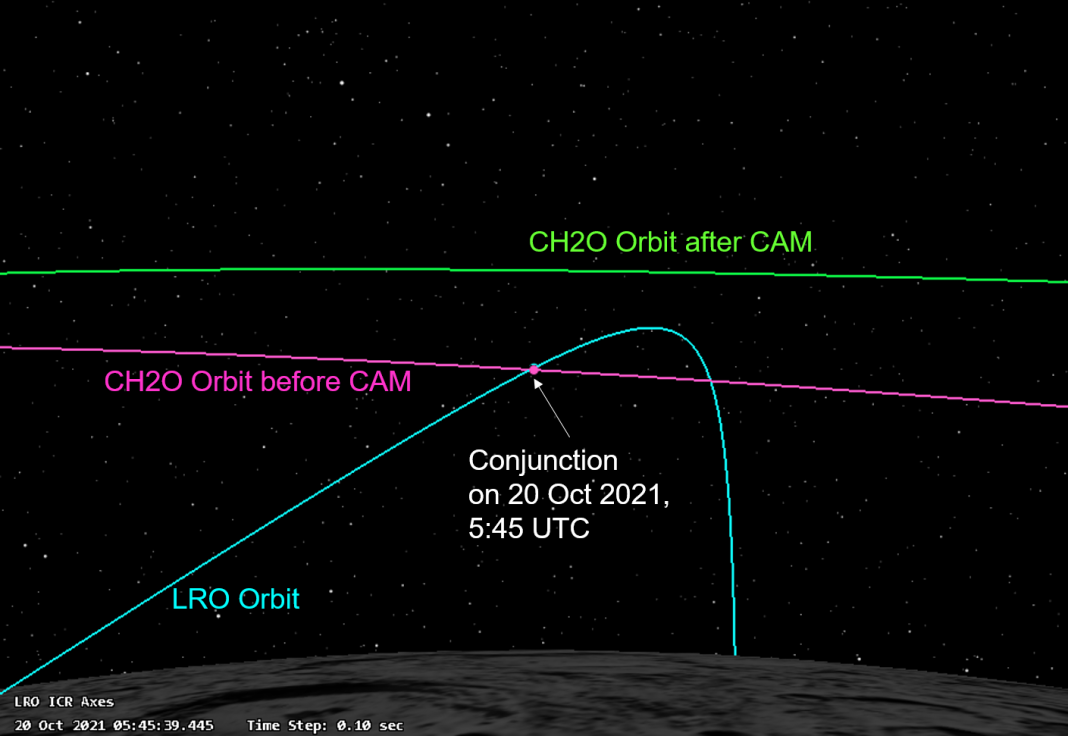 On October 20, a close conjunction between Chandrayaan-2 Orbiter (CH2O) and Lunar Reconnaissance Orbiter (LRO) of NASA was expected to take place according to the analyses of both ISRO and NASA. It showed that the radial separation between the two spacecraft would become less than 100 m and the closest approach distance would be 3km.