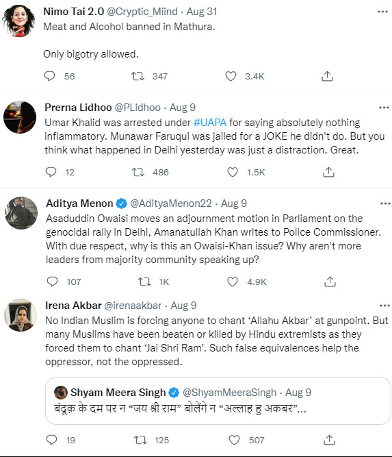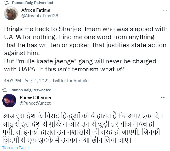 Another interesting person who she had retweeted was Puneet Sharma, who had blamed Hindus for targeting Muslims in India. In the tweet, he had written that Muslims and Muslim things are like drugs for Hindus. If, for some reason, everything related to Muslims vanished from India, Hindus would have withdrawal symptoms.
