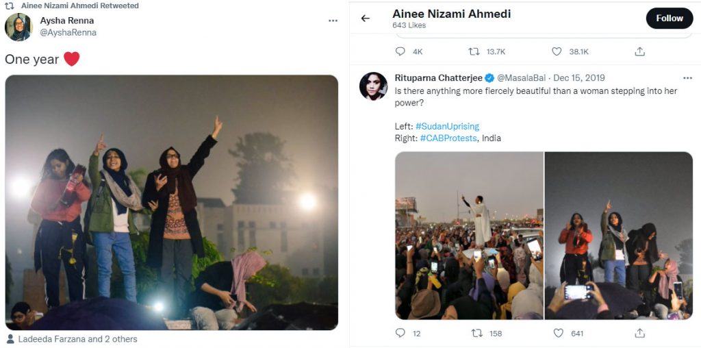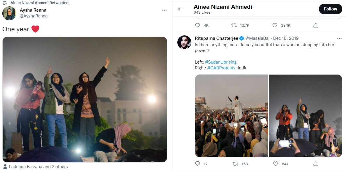 Now coming to the Digital Editor of Elle, Ainee Nizami Ahmadi. She has also locked her profile since the outrage happened against Elle’s article. Digital Editors are responsible for the content that goes on the digital platform of any brand, in this case, Elle. Again, she has a limited presence on Twitter. However, in December 2020, she has retweeted a post by Aysha Renna where Renna, along with other women, were standing on a vehicle during anti-CAA protests and raising anti-India slogans.