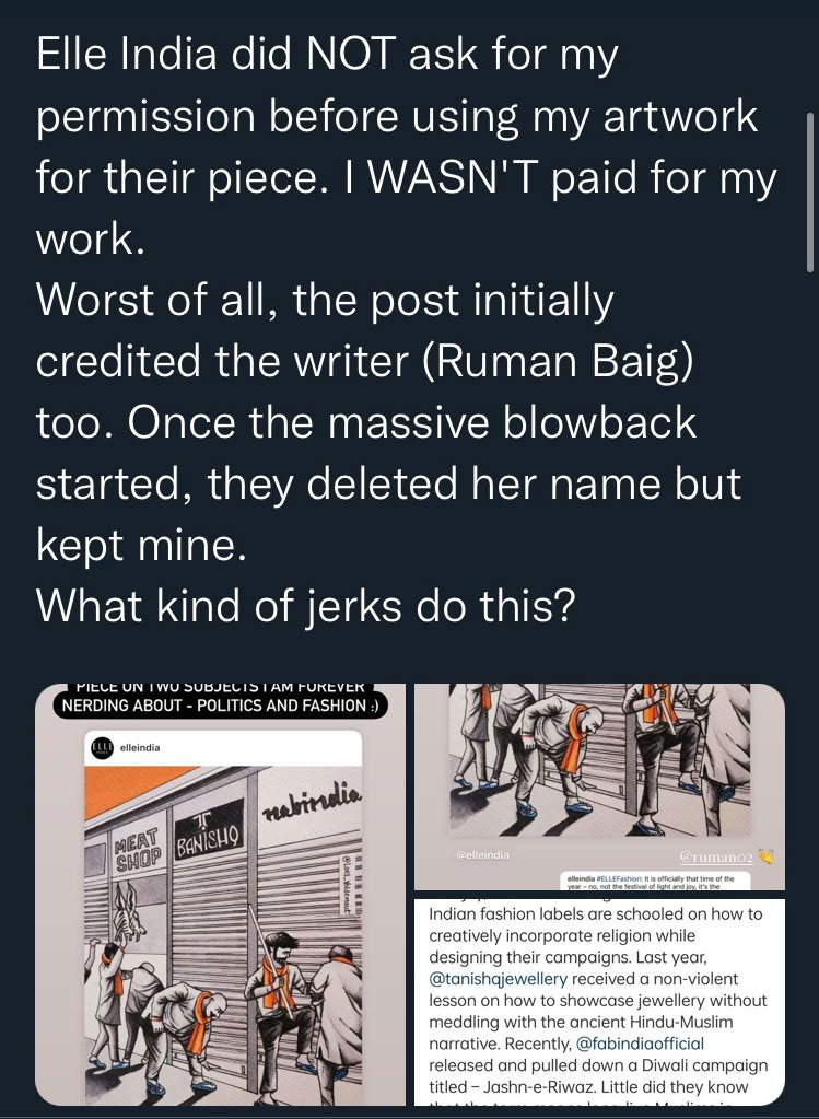 Under Ahmadi, the illustration on Elle’s Instagram account was posted in which Hindus were seen closing down shutters of FabIndia and other brands. The illustration was created by one Lord_VoldeMaut, a 19-year-old “artist” who often post anti-Hindu content on Twitter and Instagram. Now here is a catch. The “artist” has claimed that Elle… wait for it… STOLE THE ARTWORK! The illustration was allegedly posted without his/her permission on Elle’s Instagram account.