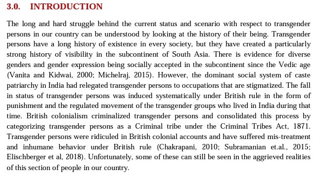 “The fall in status of transgender persons was induced systematically under British rule in the form of punishment and the regulated movement of the transgender groups who lived in India during that time. British colonialism criminalized transgender persons and consolidated this process by categorizing transgender persons as a Criminal tribe under the Criminal Tribes Act, 1871,” it adds.