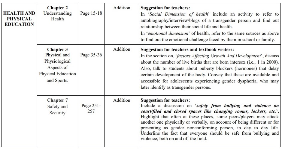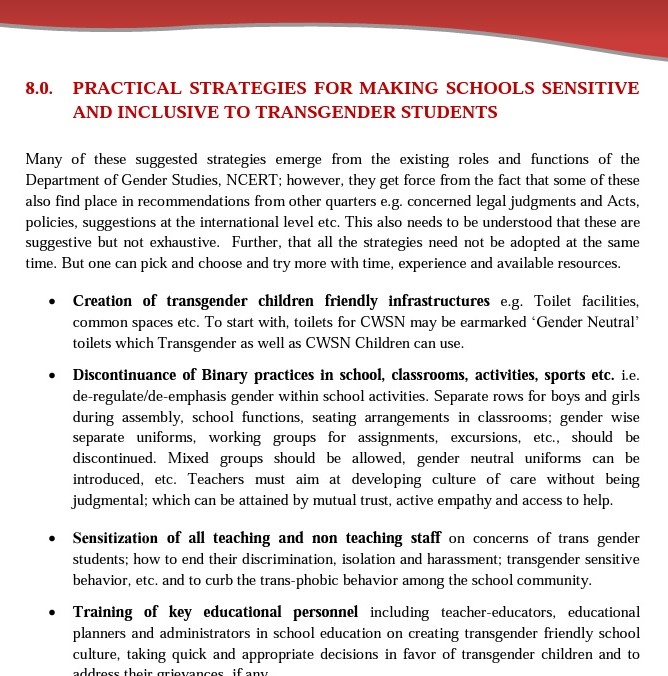The document recommends “Discontinuance of Binary practices in school, classrooms, activities, sports etc.” It says, “Separate rows for boys and girls during assembly, school functions, seating arrangements in classrooms; gender wise separate uniforms, working groups for assignments, excursions, etc., should be discontinued. Mixed groups should be allowed, gender neutral uniforms can be introduced, etc.”
