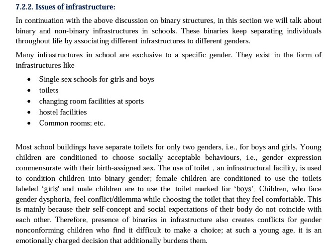 The document adds, “Children, who face gender dysphoria, feel conflict/dilemma while choosing the toilet that they feel comfortable. This is mainly because their self-concept and social expectations of their body do not coincide with each other. Therefore, presence of binaries in infrastructure also creates conflicts for gender nonconforming children who find it difficult to make a choice; at such a young age, it is an emotionally charged decision that additionally burdens them.”
