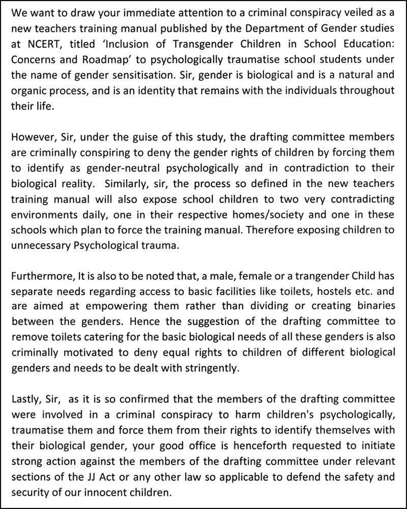 It further added that the approach taken in the manual would expose the children to unnecessary psychological trauma as they would face contradictory environments at home and in school. The complainant further objected to the point where the manual suggested the teachers should discuss puberty blockers and their availability for adolescents with the students. The complainant also raised questions on the background and qualification of the members who were part of the drafting committee.