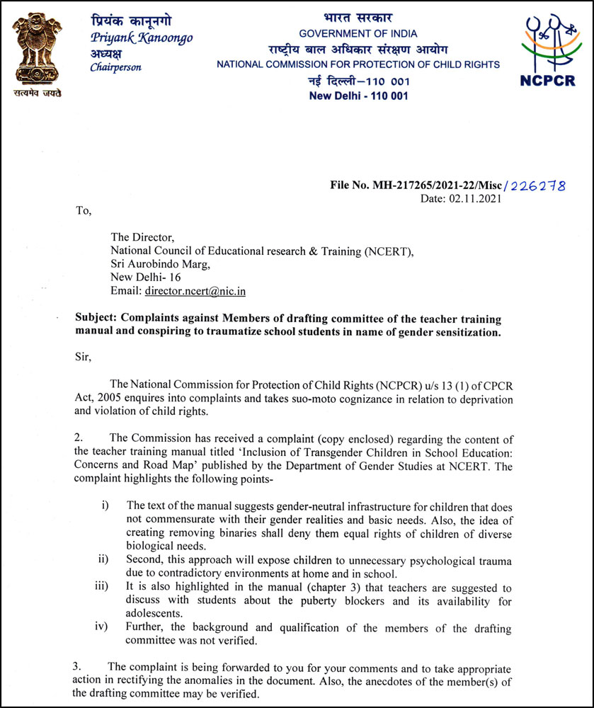 On November 2, the National Commission for Protection of Child Rights (NCPCR) has taken cognizance of the NCERT manual aimed at ‘gender sensitization in schools. The NCPCR took cognizance of the matter under section 13 (I) of CPCR Act, 2005, based on a complaint filed by one Vinay Joshi from Maharashtra.