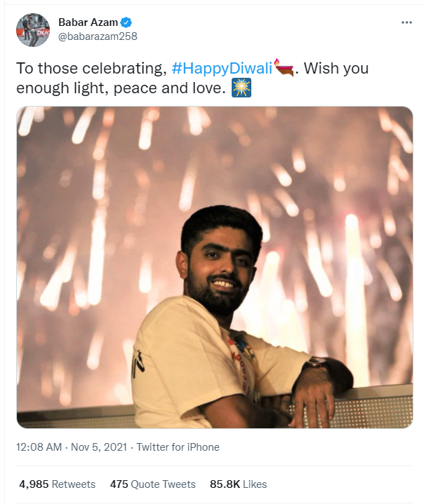 In a tweet, Babar Azam stated, “To those celebrating, #Happy Diwali. Wish you enough light, peace and love.” The Pakistani skipper had shared a picture of him with the background of burning firecrackers. He was however cautious to make it a generalised statement and avoid the mention of the word ‘Hindu.’ Despite this, he was slammed by Islamists in Pakistan for committing the sin of idolatry (Shirk).