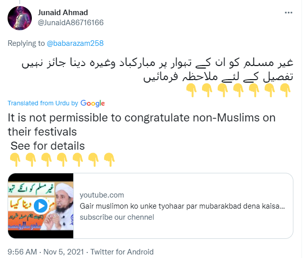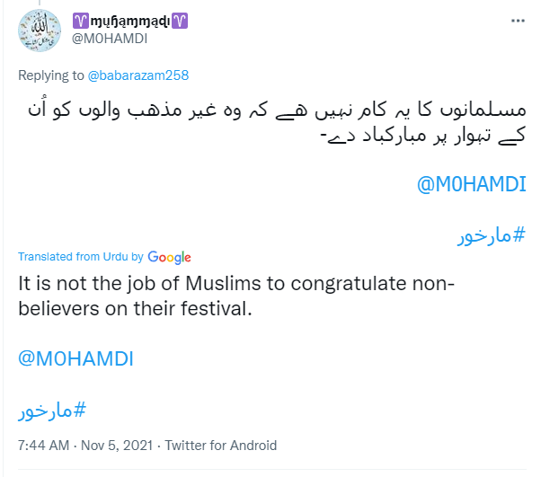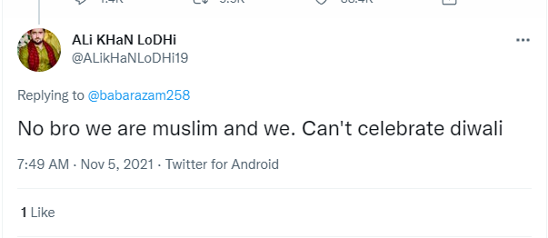 One Ali Khan Lodhi cautioned, “No bro, we are Muslim and we can’t celebrate Diwali.” It must be mentioned that Babar Azam did not participate in the rituals of the Hindu festivals and merely tweeted a generalised greeting without the explicit mention of Hindus.