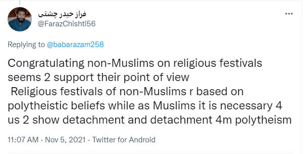 One Faraz Chisti cautioned that it was not permissible to endorse polytheistic beliefs. “Congratulating non-Muslims on religious festivals seems to support their point of view. Religious festivals of non-Muslims are based on polytheistic beliefs while as Muslims it is necessary for us to show detachment and detachment from polytheism,” he remarked.