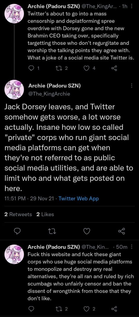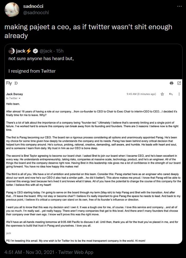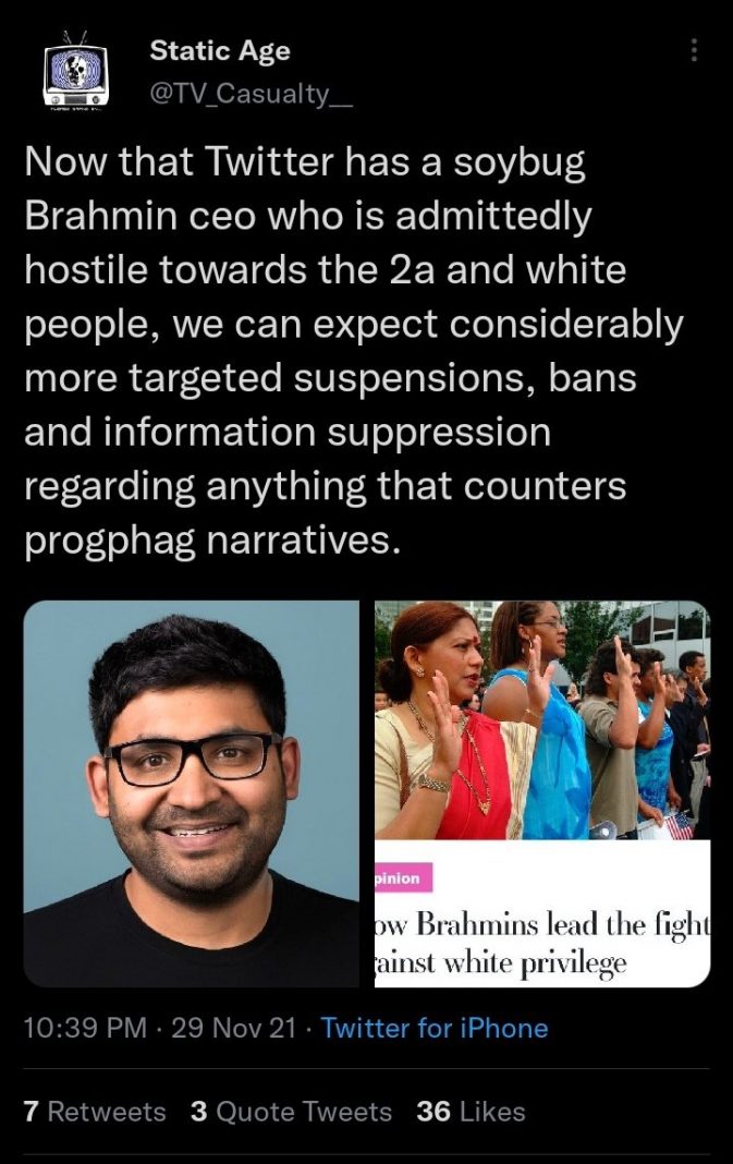 It appears that they believe that Twitter will turn more left-leaning because the new CEO is a “Brahmin”, which he is not.