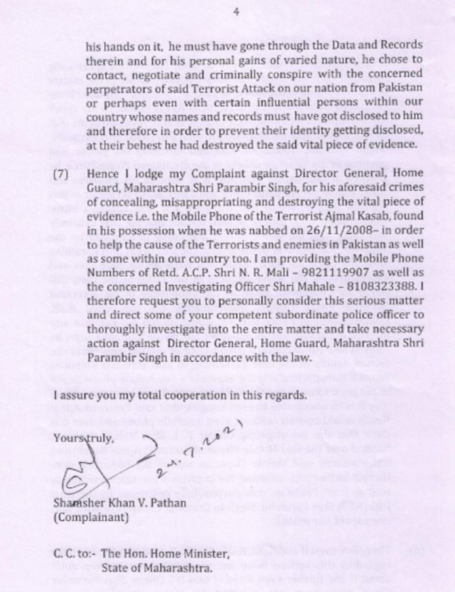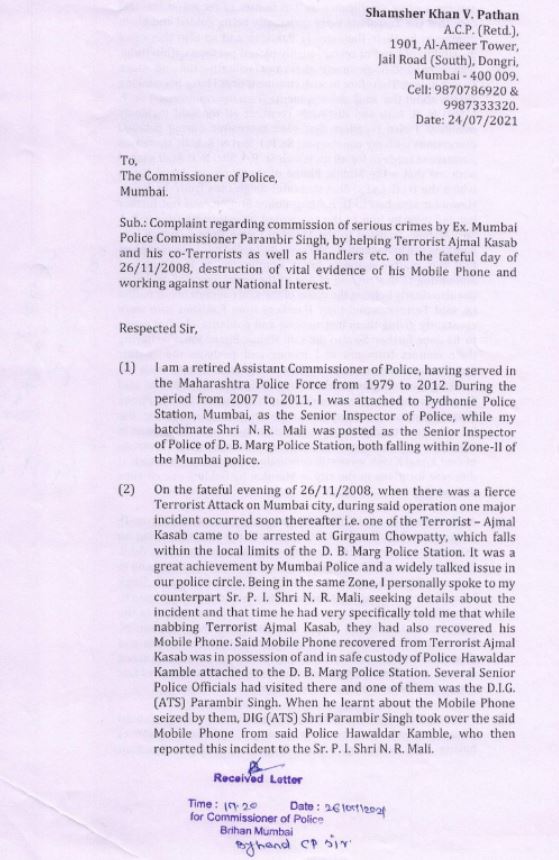 Accusing Param Bir Singh of quelling the inquiry using his position and authority, Shamsher K Pathan alleged that “during 26/11 terrorist attacks, Param Bir Singh, the then DIG ATS, confiscated terrorist Ajmal Kasab’s phone, ensuring that phone never appeared during the probe or trial”.