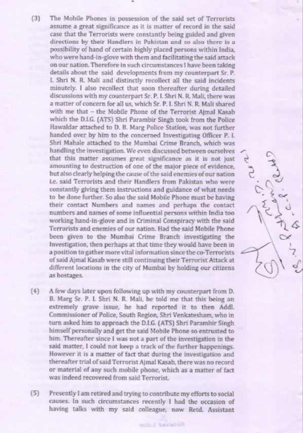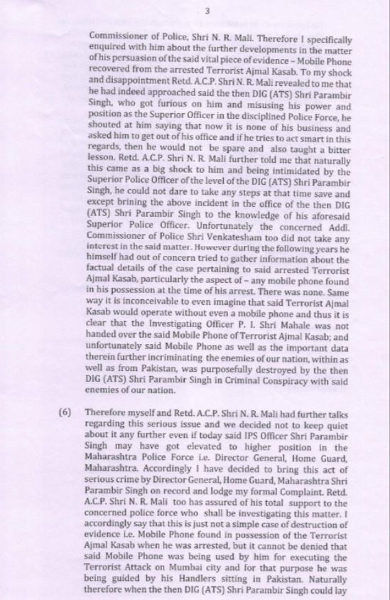 “I also recollect that soon thereafter during detailed discussions with my counterpart Sr. P. I. Shri N. R. Mali, there was a matter of concern for all us, which Sr. P. I. Shri N. R. Mali shared with me that the Mobile Phone of the Terrorist Ajmal Kasab which the D.I.G. (ATS) Shri Parambir Singh took from the Police Hawaldar attached to D. B. Marg Police Station, was not further handed over by him to the concerned Investigating Officer P. I. Shri Mahale attached to the Mumbai Crime Branch, which was handling the investigation. We even discussed between ourselves that this matter assumes great significance as it is not just amounting to the destruction of one of the major piece of evidence, but also clearly helping the cause of the said enemies of our nation,” read the letter.