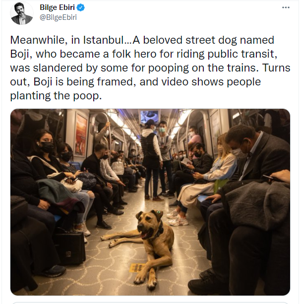 On Saturday (November 20), journalist Bilge Ebiri informed that Boji was accused of taking a dump in trains. He pointed out that the dog was being framed and that the faecal matter was planted by a man. “Meanwhile, in Istanbul…A beloved street dog named Boji, who became a folk hero for riding public transit, was slandered by some for pooping on the trains. Turns out, Boji is being framed, and video shows people planting the poop,” Ebiri tweeted.