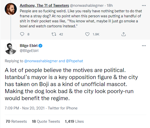 Journalist Bilge Ebiri informed about the political motives behind framing a dog. “Istanbul’s Mayor is a key Opposition figure and the city has taken on Boji as a kind of ‘unofficial mascot.’ Making the dog look bad and the city look poorly-run would benefit the regime.”