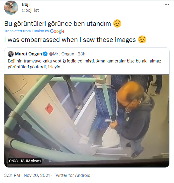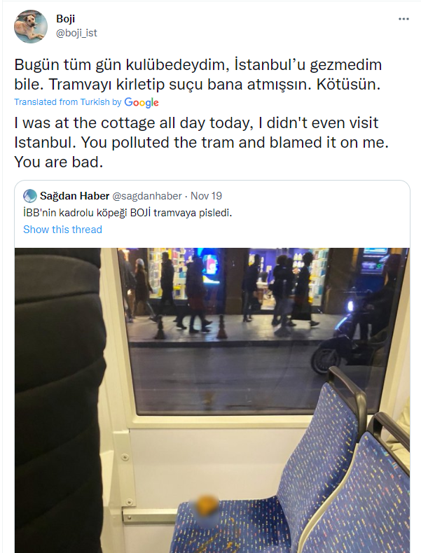 The official Twitter account of Boji (@boji_ist) responded to accusations of him, defecating on a train seat. “I was at the cottage all day today, I didn’t even visit Istanbul. You polluted the tram and blamed it on me. You are bad,” the handle tweeted.