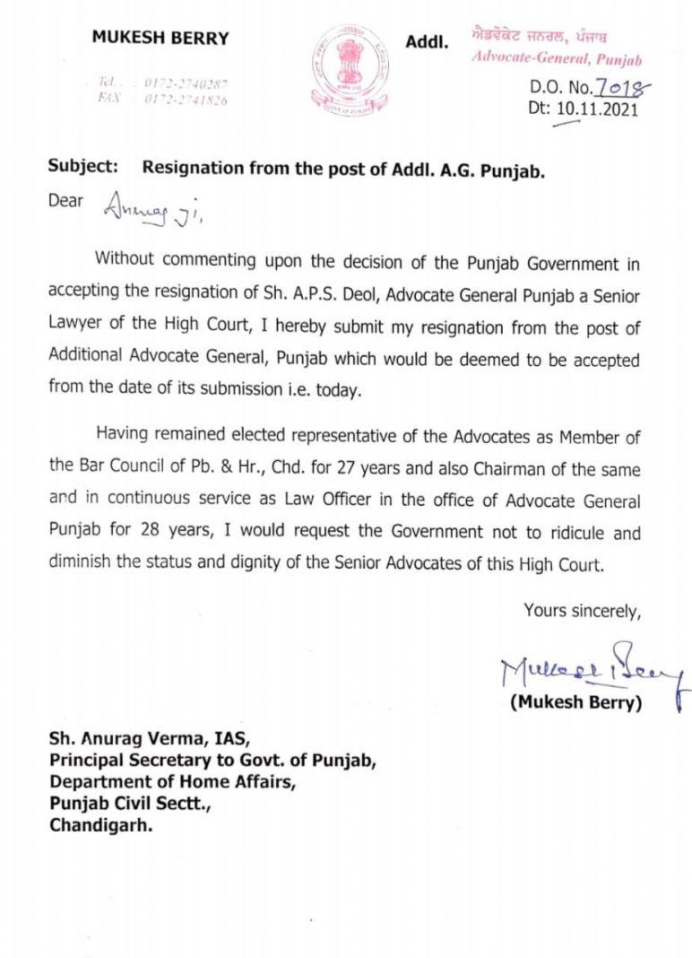 His resignation letter dated November 10 sent to Anurag Verma, principal secretary of Home Affairs of Punjab, is self-explanatory as to why he resigned and whom he asked not to ridicule and diminish the status of senior advocates. Berry and Tarun Vir Singh Lehal (son-in-law of Punjab Deputy Chief Minister Sukhjinder Singh Randhawa), were appointed as additional advocate general on Monday.