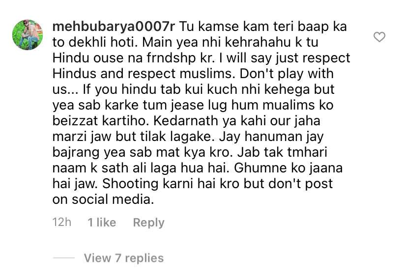 However, Islamists on Sara’s Instagram comments section were evidently angry with the actor for being a Muslim and yet visiting a Hindu shrine. A barrage of despicable comments were made against the actor because she visited the hallowed shrine of Kedarnath, the abode of Hindu God Lord Shiva.