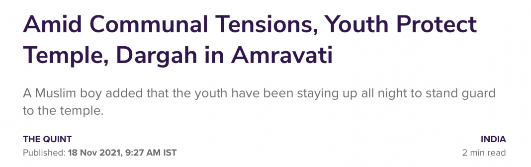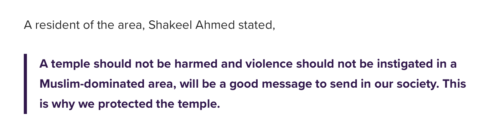 Once the blame has been established, The Quint went on to prove that the Muslims of the area where the Muslim mob went on rampage were good samaritans. They claimed that “youths” stayed up for 3 days straight to protect a Shiva Temple situated in the Muslim dominated area.