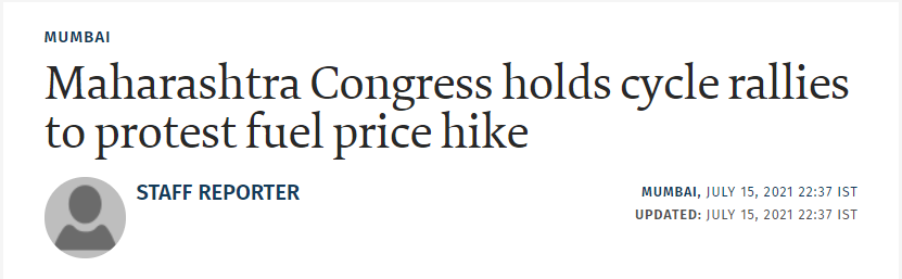 In the following month, the grand-old-party organised cycle rallies in Mumbai and other parts of Maharashtra against hike in diesel and petrol prices. The Congress rally, which began from Hanging Gardens to Raj Bhavan, was led by State Chief Nana Patole. The party, which is an ally in the Maha Vikas Aghadi government, met the Governor and handed out a amemorandum about issues faced by people. Patole had claimed, “People of the country are getting no respite from rising prices. Bharatiya Janata Party (BJP) leaders are advising States to reduce taxes. States do not get their rightful GST compensation, but the Centre is happily collecting taxes,” Mr. Patole said