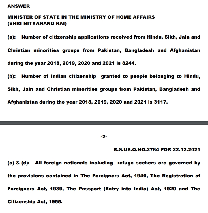 Rai was responding to a question raised by Dr. K Keshava Rao of Telangana Rashtra Samithi (TRS) who sought the details of total citizenship applications received from Hindu, Sikh, Jain, and Christian minorities from Pakistan, Bangladesh, and Afghanistan during the years 2018 and 2021.