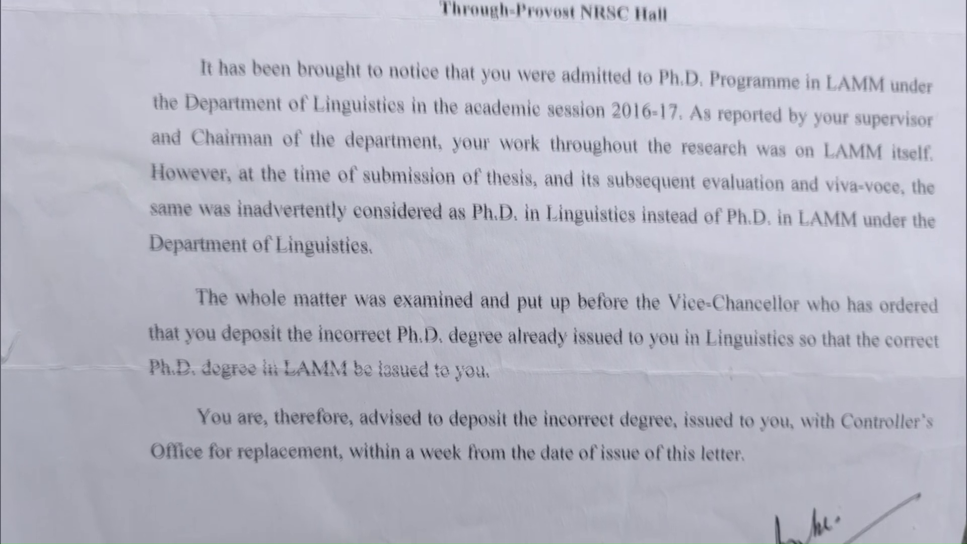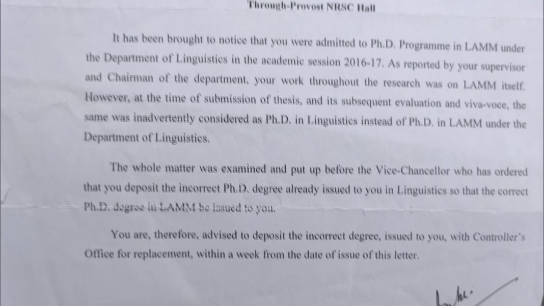 “It has been brought to notice that you were admitted to the PhD programme in LAMM under the Department of Linguistics in the academic session 2016-2017. As reported by your Supervisor and Chairman of the Department, your work throughout the research was on LAMM itself. However, at the time of submission of the thesis, and its subsequent evaluation and viva-voce, the same was inadvertently considered as PhD in Linguistics instead of PhD in LAMM under the Department of Linguistics,” read a notice issued by the varsity.