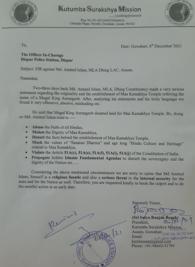 The complaint letter addressed to the officer-in-charge of the Dispur Police Station read, “Two-three days back, Md. Aminul Islam, MLA, Dhing Constituency made a very serious statement regarding the originality and the establishment of Maa Kamakhya Temple referring to the name of a Mughal King, Aurangzeb. After, analyzing his statements and body language we found it very offensive, abusive, misleading etc”.