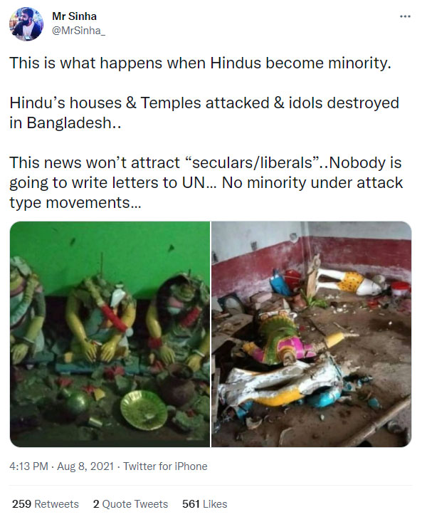 The complaint refers to a tweet by Sinha that he published in August 2021. On August 8, 2021, Sinha had published two photographs on Twitter in which idols of Hindu Gods and Goddesses could be seen destroyed in a temple in Bangladesh. In the tweet, Sinha wrote, “This is what happens when Hindus become a minority. Hindu’s houses & Temples attacked & idols destroyed in Bangladesh. This news won’t attract “seculars/liberals”. Nobody is going to write letters to UN. No minority under attack type movements.”