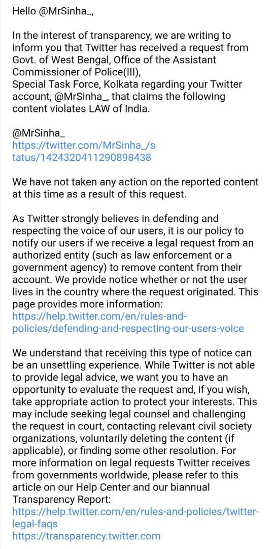 On December 2, Twitter user MrSinha_ got an email from Twitter that they have received a complaint against one of his posts on their platform. In the email, Twitter said that Govt. of West Bengal, Office of the Assistant Commissioner of Police(III), Special Task Force, Kolkata had sent the request to take action against a particular tweet as it “violates the LAW of India.”