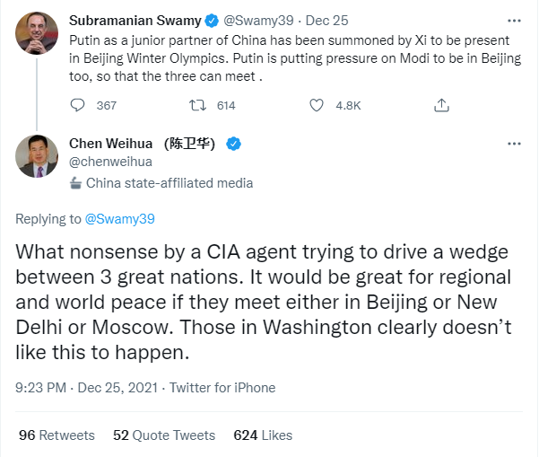 While responding to his tweet, State media China Daily (EU Bureau) chief Chen Weihua slammed Swamy for spreading discontentment between India, Russia, and China. Weihua wrote, “What nonsense by a CIA agent trying to drive a wedge between 3 great nations.”