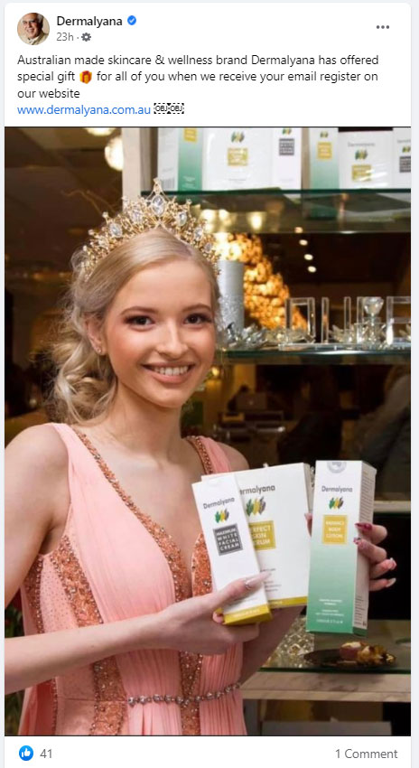 There were two posts on the page linked to ‘Dermalyana’ that were still active by the time this report was written. One of the posts was published yesterday with a woman holding the company’s products. The post read, “Australian made skincare and wellness brand Dermalyana has offered a special gift for all of you when we receive your email registered on our website.”