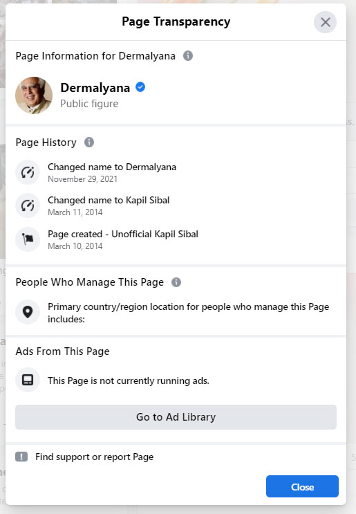 Sibal’s verified Facebook page’s information was changed to Dermalyana on November 29, 2021. The page, which was created as an unofficial page in 2014 and then switched to the official page for the Congress leader in the same month, seems to be inactive for a long time as the last post from it was from April 2019. It is also possible that the hackers might have deleted previous posts.