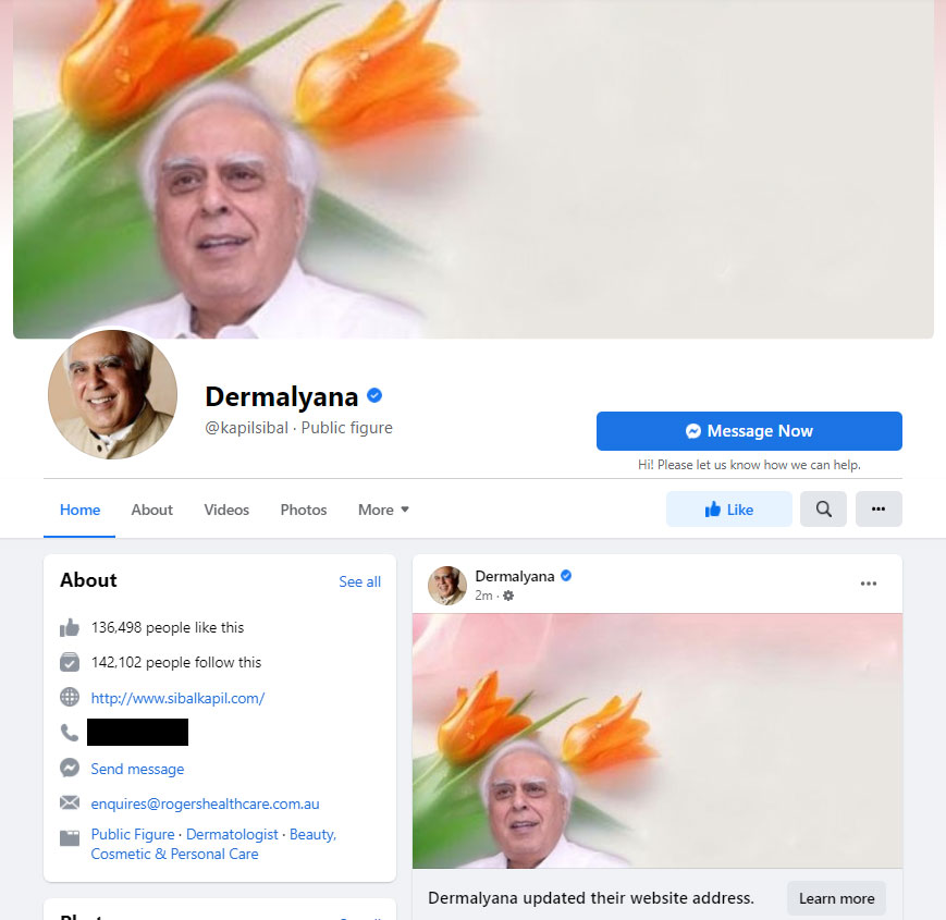 Before the information on the page got changed, the email was linked to it was rogerhealthcare.com.au. The category of the page was also changed to Dermatologist. The hackers had also changed the cover and feature image of the page that was later changed to Kapil Sibal’s.