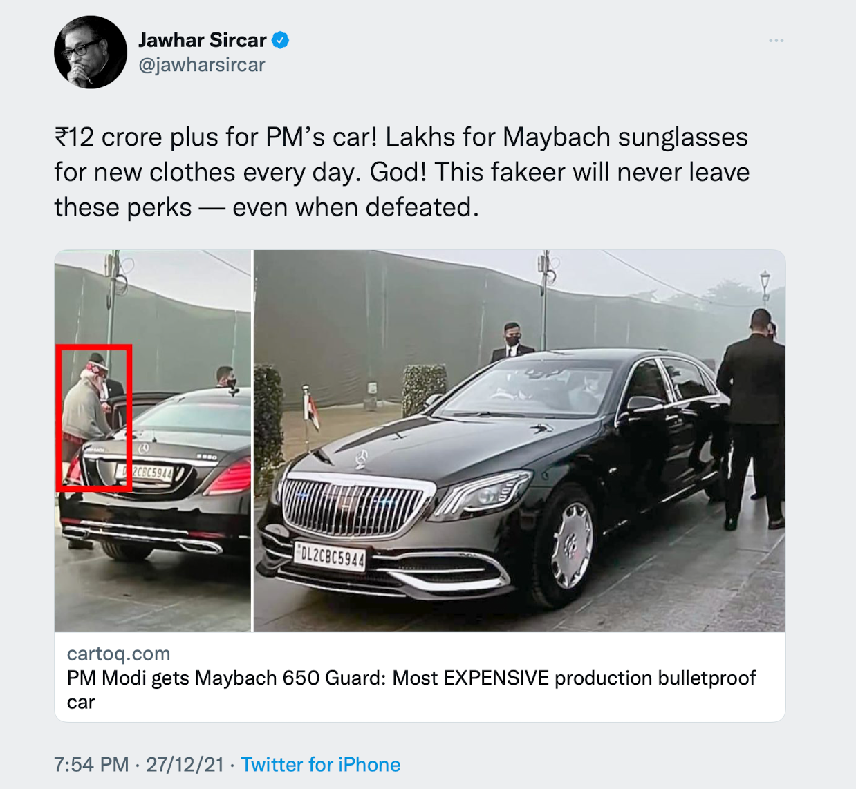 Regardless of the final price of the armoured vehicle, Sircar, through his tweet, tries to insinuate that a state of the art car is not used for fortifying the security of the head of the state but for satisfying the vanity of PM Modi. He conveniently ignores the fact that the armoured vehicle is for the post of India’s Prime Minister and not for the person who is currently occupying the post. The Prime Minister is not going to inherit the car when he retires from public office or when he is replaced by another one.
