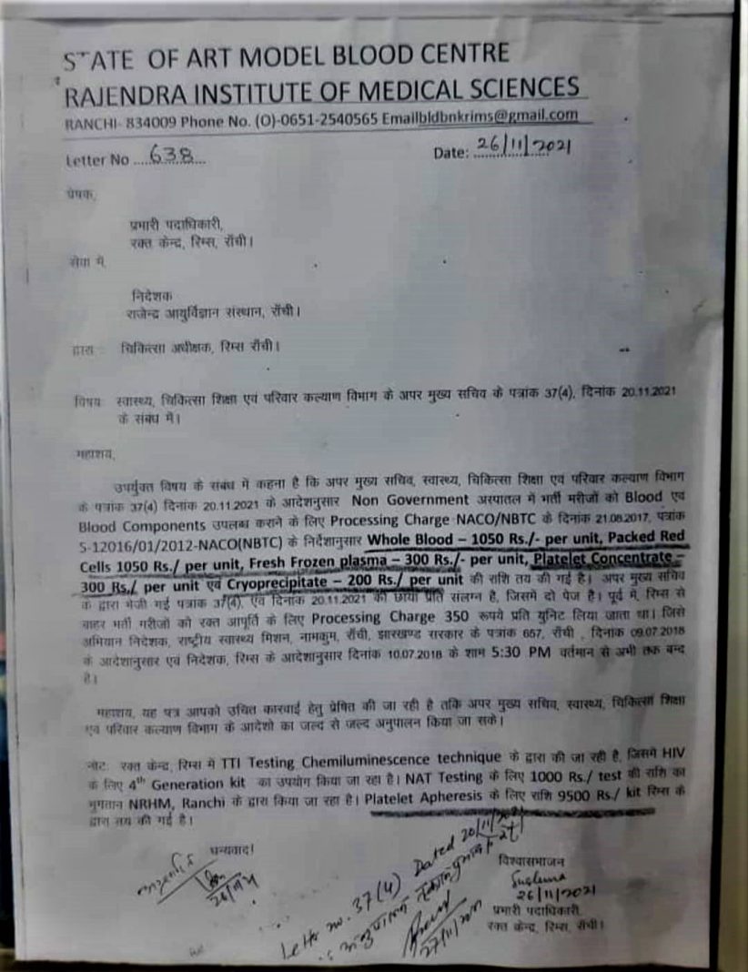 On November 20, the state health and family welfare department headed by minister Banna Gupta issued an order in this regard. As per the order, private hospitals taking blood for beneficiaries of the Ayushman Bharat and other health insurance schemes in Jharkhand will have to make a payment to get blood from the government-run blood banks. In fact, Rajendra Institute of Medical Sciences (RIMS) has already issued an order to charge money from patients who are admitted at RIMS.