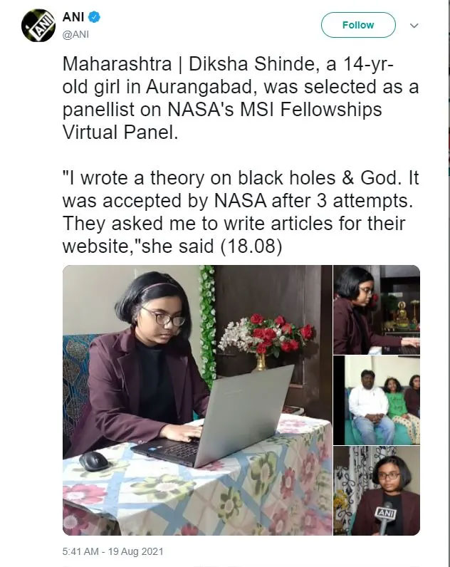 Coming to August 2021, Diksha Shinde, a young girl from Aurangabad made it to the headlines. The 14-year-old girl from Maharashtra was a subject of discussion for days after ANI reported she was selected as a panellist on the Minority Serving Institution (MSI) Fellowships Virtual Panel of National Aeronautics and Space Administration (NASA). The class 10 student had claimed that she was selected for the 2021 MSI Fellowships Virtual Panel in June after the International Journal of Scientific and Engineering Research accepted her research paper on ‘We Live in Black Hole?’ in May 2021.