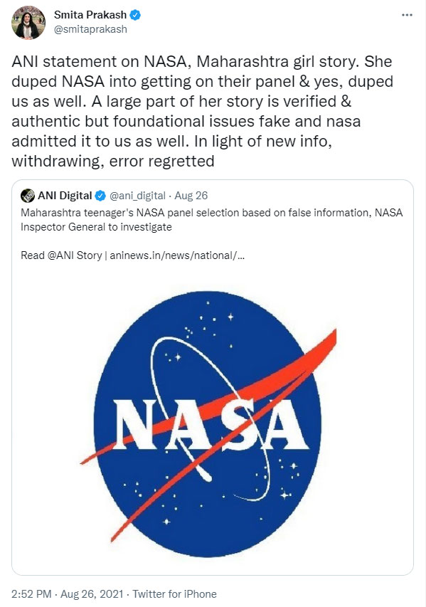 As the girl had used fake credentials for applying to be a panellist, NASA said they have started reviewing their verification process for the selection of panellists. They also added that NASA is not funding her trip to the USA. ANI later withdrew the report.