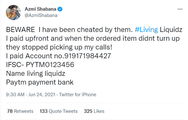 Shabana Azmi, the well-known Bollywood actress and wife of lyricist-politician Javed Akhtar, was duped by an alcohol delivery scam in June this year. In a tweet, Azmi said, “BEWARE I have been created by them. #Living Liquidz I paid upfront, and when the ordered item didn’t turn up, they stopped picking up my calls!”