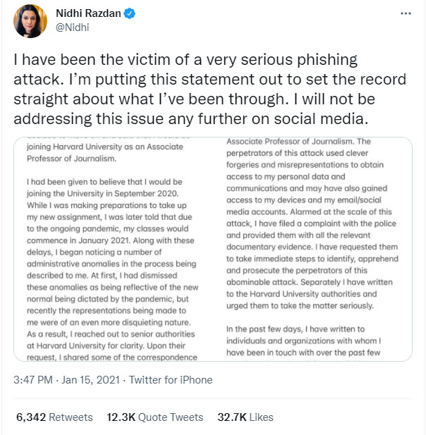 She added, “I did not, in fact, receive an offer by Harvard University to join their faculty as an Associate Professor of Journalism. The perpetrators of this attack used clever forgeries and misrepresentations to obtain access to my personal data and communications and may have also gained access to my devices and my email/social media accounts.” The journalist was allegedly scammed in such a way that she could not ‘spot the scam’ for months. Unbelievable, but true as per her words.