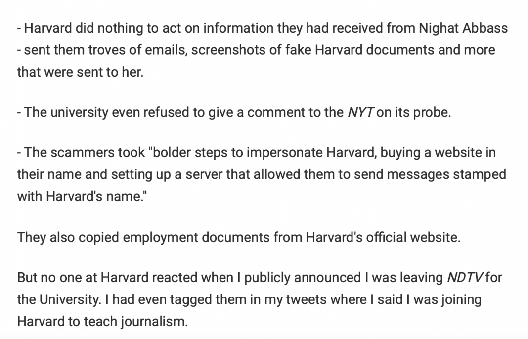 In the blog, Nidhi has stated that Harvard University has refused to give a comment to the NYT on its investigation. Adding that Harvard had not done anything even after BJP leader Nighat Abbas sent emails and all details of how some people are impersonating the University and contacting people on their behalf, Nidhi criticised the University for not doing enough to prevent fraud being committed in their name.
