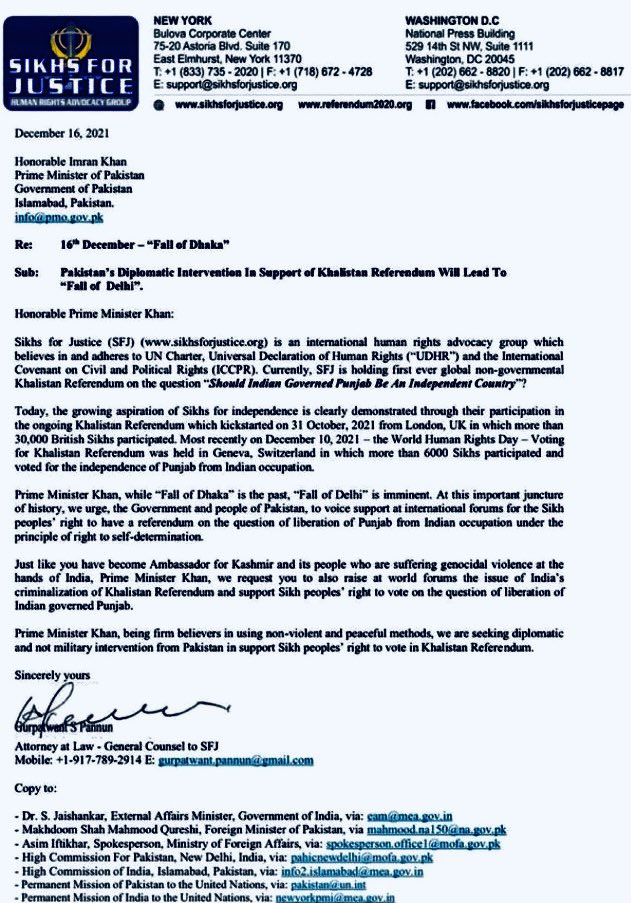 Pannu had written to Prime Minister of Pakistan, Imran Khan, to support SFJ to “Free Punjab” and form “Khalistan”. In the letter addressed to Khan on December 16, terrorist organization SFJ called itself a “human rights advocacy group”. The letter read, “SFJ is conducting its first-ever global non-governmental Khalistan Referendum on the question ‘should Indian governed Punjab be an Independent country”?” and sought his support in the referendum.